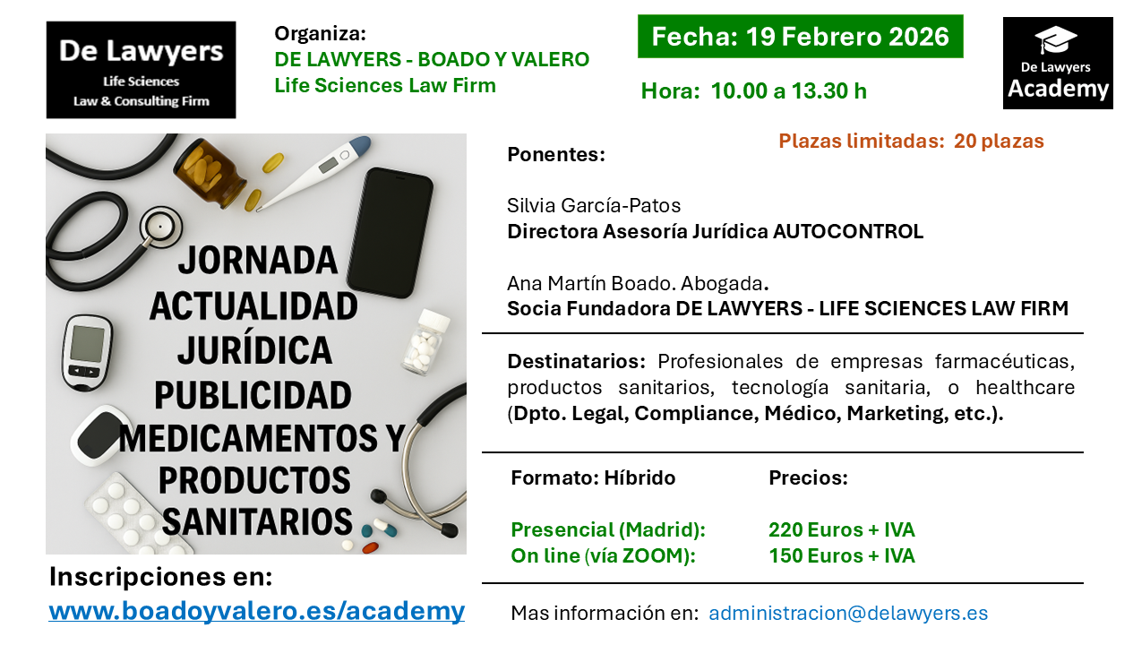 DE LAWYERS - BOADO Y VALERO currently has an Academy through which it offers webinars, conferences, and courses on legal and/or compliance matters in the Life Sciences sector.